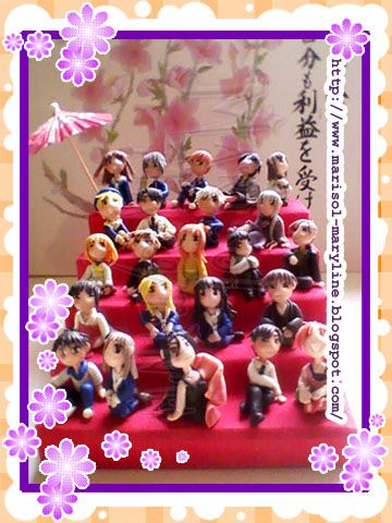 Conjunto de 23 peças confeccionadas em biscuit (massa de porcelana fria). Vem com plataforma encapada com papel camurça e com dois guarda-chuvas de papel. Fundo ilustrativo. Medidas aproximadas de cada boneco: 4 x 2 x 2 cm, plataforma: 9 x 15 x 19 cm (altura x largura x profundidade). Para mais fotos e informações: http://marisol-maryline.blogspot.com.br/2013/03/biscuit-hinamatsuri-de-fruits-basket.html